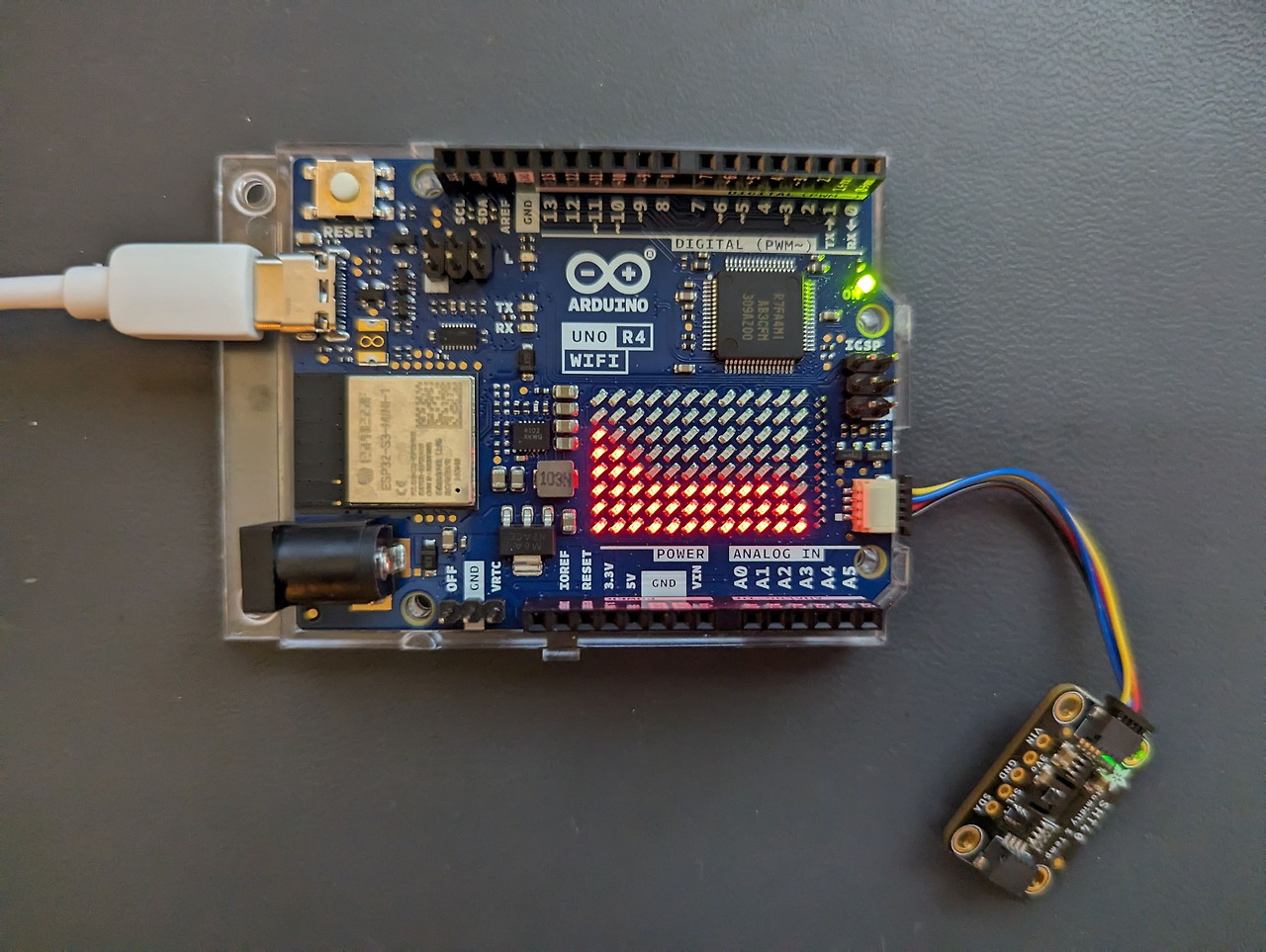 이는 Arduino Uno R4 Wifi의 LED 매트릭스를 사용하여 Sensirion SHT4x 습도 온도 센서의 신호를 표시하는 방법을 보여주는 데모입니다.