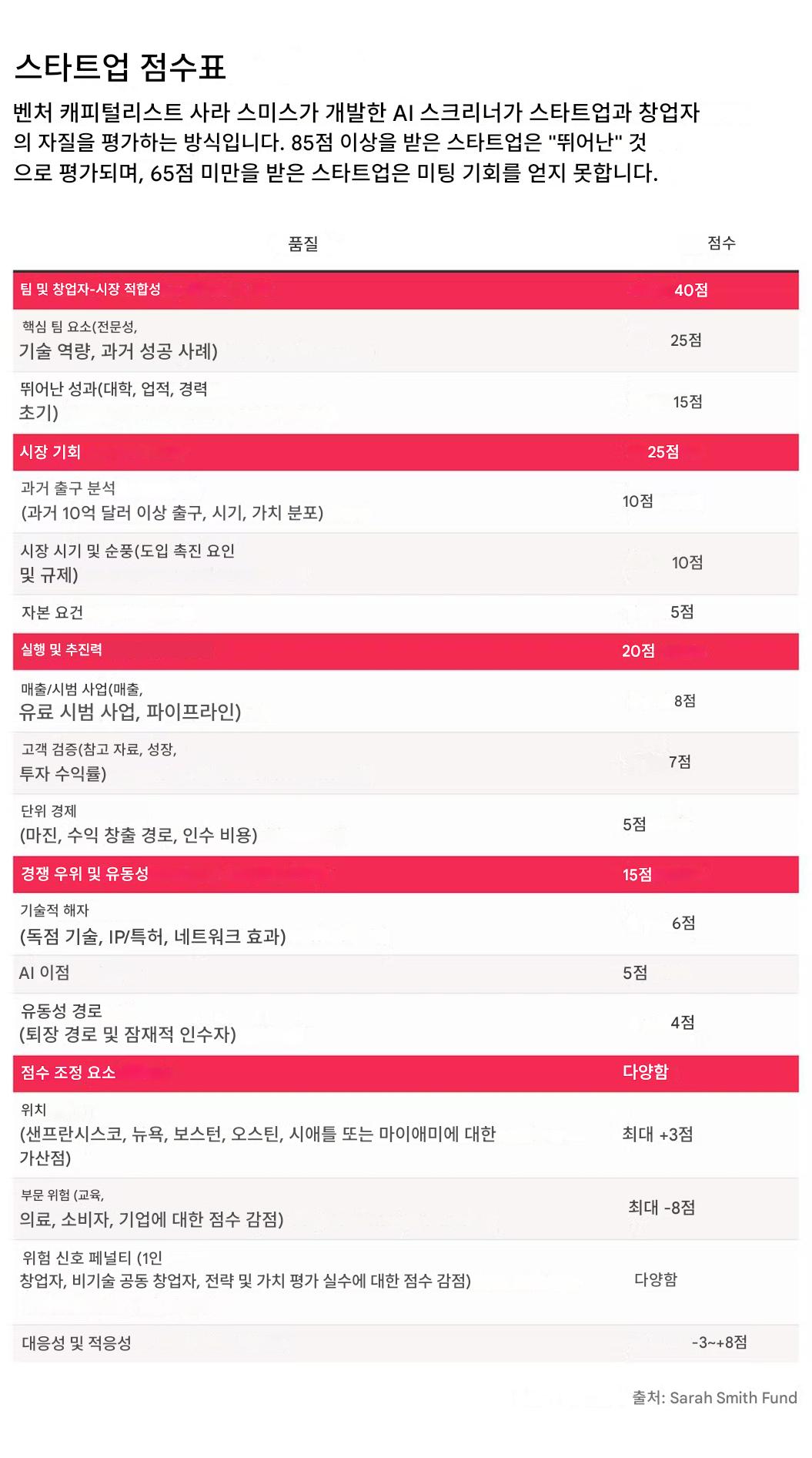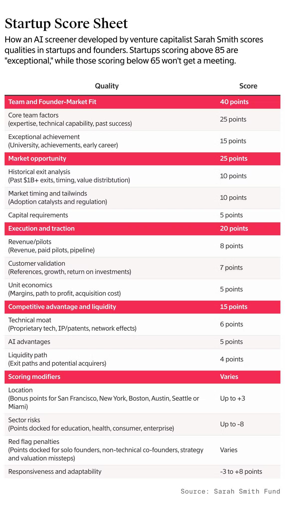 스타트업 점수표 벤처 캐피털리스트 사라 스미스가 개발한 AI 스크리너가 스타트업과 창업자의 자질을 평가하는 방식입니다. 85점 이상을 받은 스타트업은 "뛰어난" 것으로 평가되며, 65점 미만을 받은 스타트업은 미팅 기회를 얻지 못합니다.