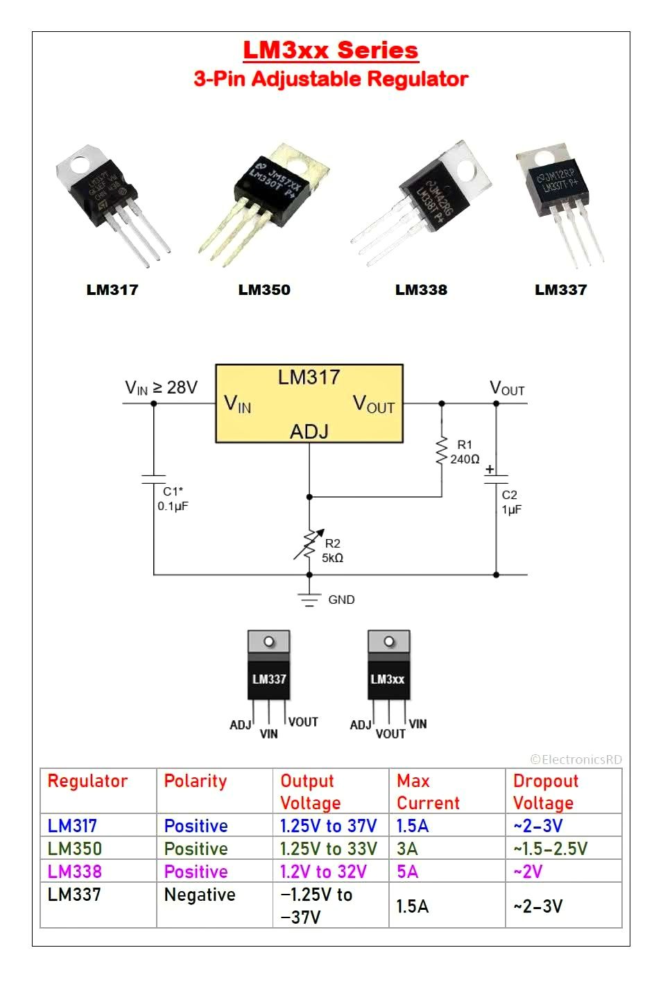 LM3xx 시리즈는 양극(LM317, LM350, LM338) 및 음극(LM337) 출력 모두에 사용되는 널리 사용되는 3핀 가변 전압 레귤레이터로 구성되어 있습니다.