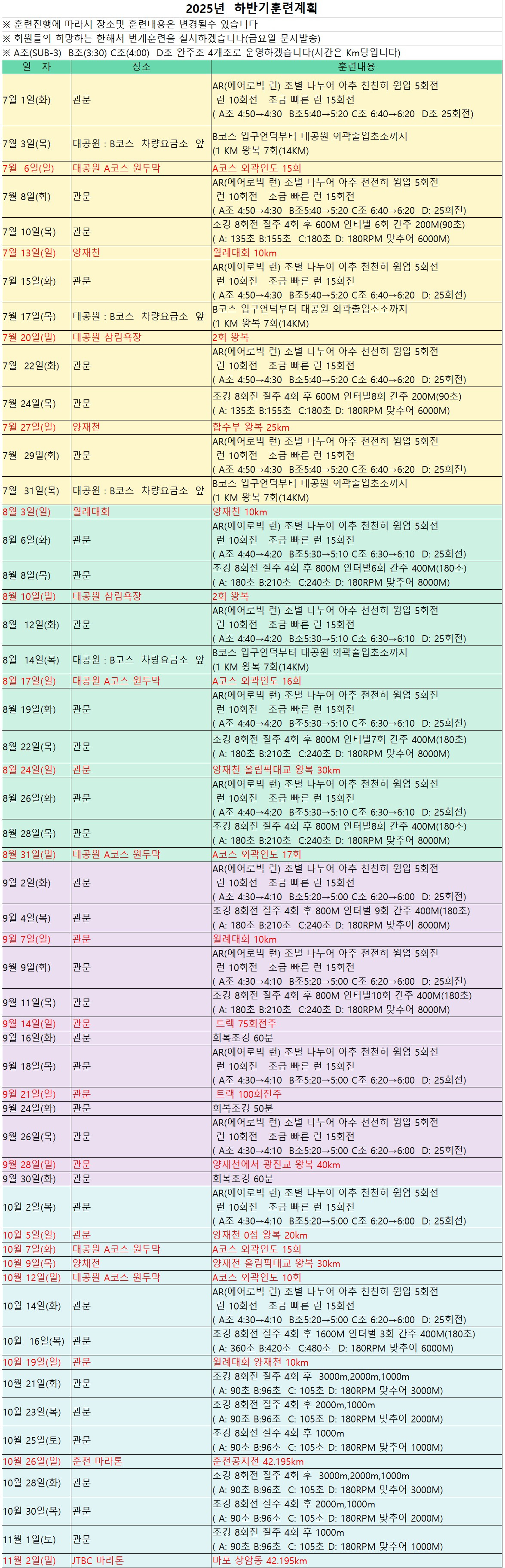 - 8월 24일(일) 06:00 관문 양재천 올림픽대교 왕복(35km) 또는 3시간주 더위가 힘드거나 느린 완주를 목표하시는 분들은 일찍 출발하시는 것을 권장합니다