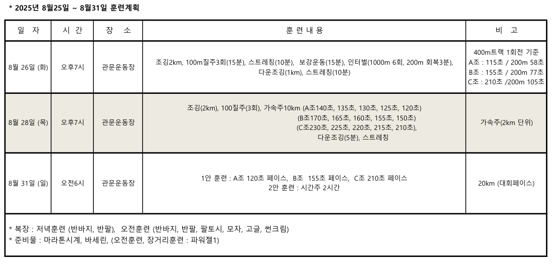 - 8월 21일 (목) 19:30 관문조깅 8회전 질주 4회 후 800M 인터벌 7회(대회 페이스 보다 km당 5초 빠르게) 간주 200M(100초)
