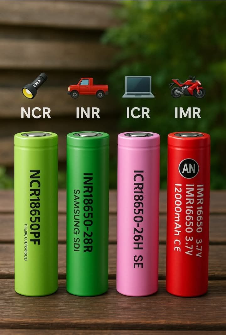 이 이미지는 네 가지 유형의 리튬 이온 원통형 배터리(18650 형식)를 화학 성분과 주요 용도를 나타내는 라벨과 아이콘으로 보여줍니다: