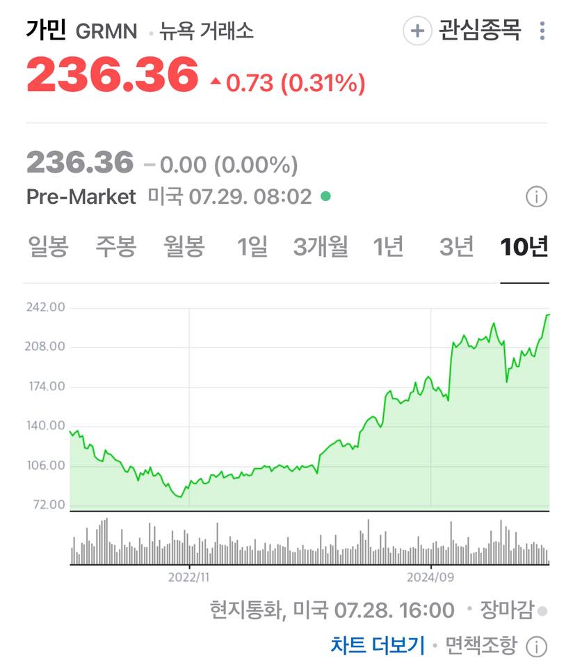 현재 가민의 시가총액은 455억 달러(약 63조원)에 달하고 주가는 연일 사상 최고치를 경신하고 있다.