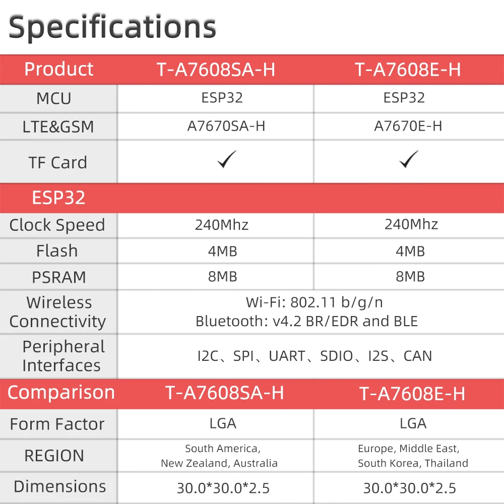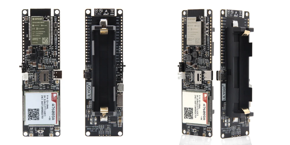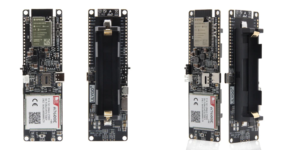- T-A7608SA-H와 T-A7608E-H 모두 WIFI 및 Bluetooth 기능을 실현할 수 있는 ESP32 칩이 장착되어 있으며 SIM 카드 슬롯과 TF 카드 슬롯이 장착되어 있습니다.