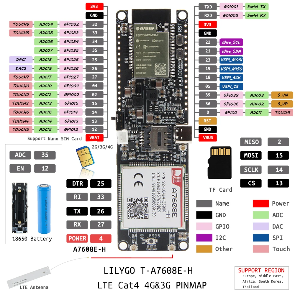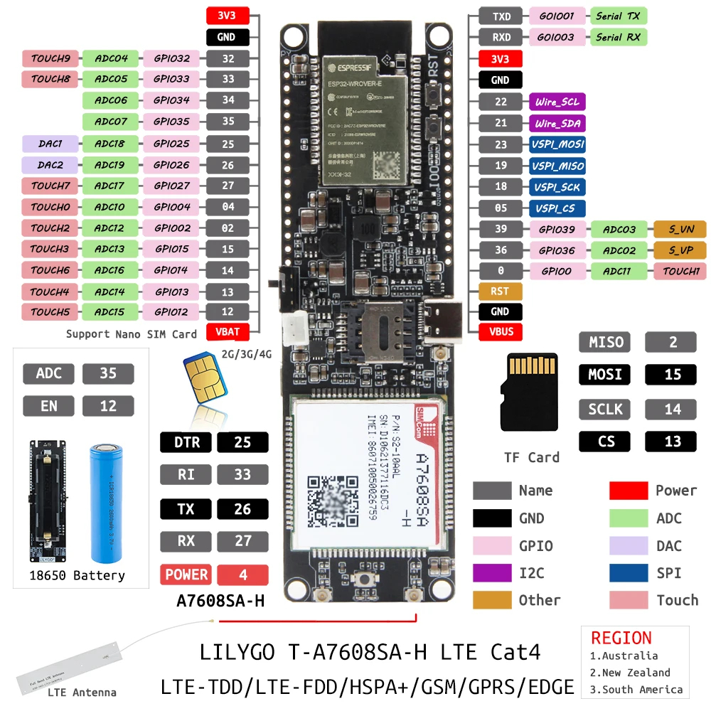 LILYGO® T-SIM A7608E-H A7608SA-H ESP32 LTE Cat 4 High Speed 4G Network GPS Antenna Wireless WiFi Bluetooth Development Board