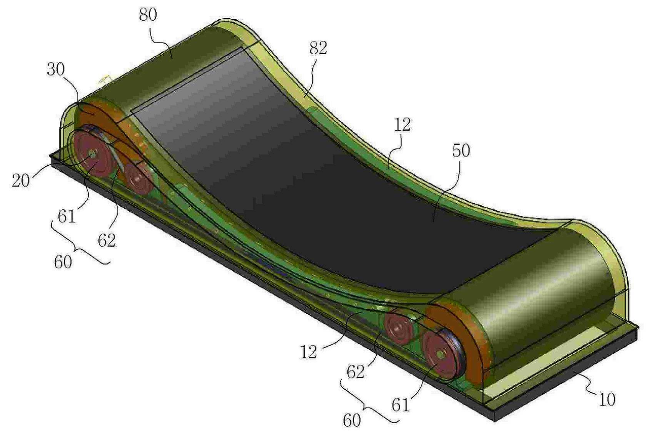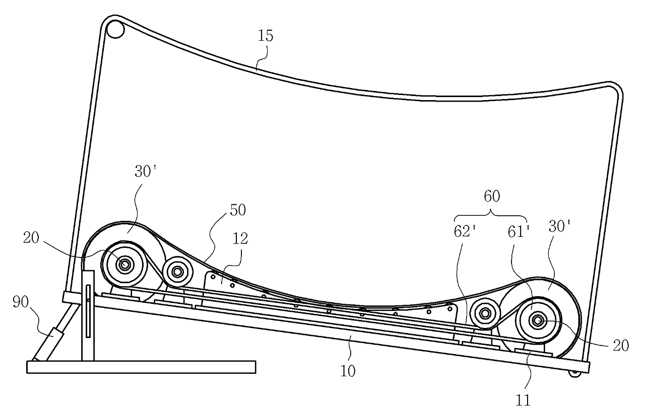 본 발명의 구성은 프레임; 프레임의 선단과 후단에 평행하게 횡설되는 회전축; 회전축의 양단에 각각 설치되는 스프로킷; 양측 스프로킷에 감기는 체인; 체인의 둘레를 감싸며 체인과 부분적으로 고정되는 런닝 벨트; 상부로 노출된 런닝 벨트가 선단으로 갈수록 경사도가 커지도록 하는 경사도 형성수단; 으로 구성된다.