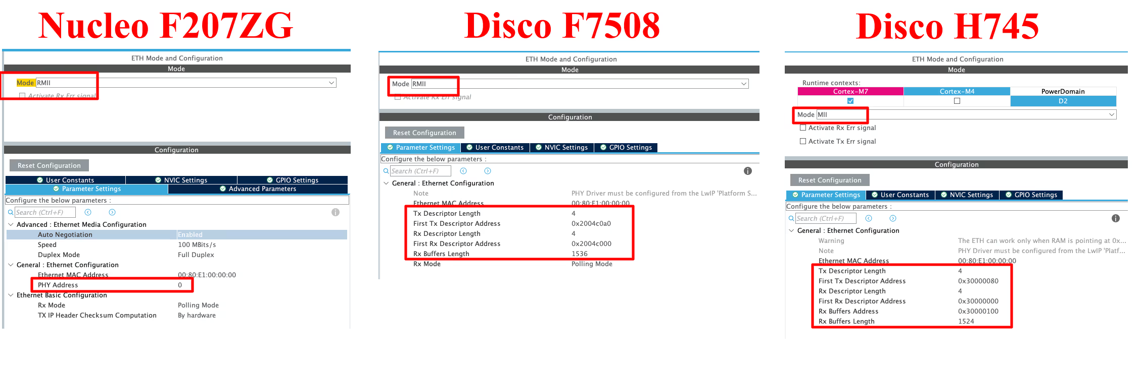 - 첫 번째 보드( Nucleo F207ZG )와 두 번째 보드( Disco F7508 )는 RMII 핀아웃을 사용하는 반면, 세 번째 보드( Disco H745 )는 MII 핀아웃을 사용합니다.