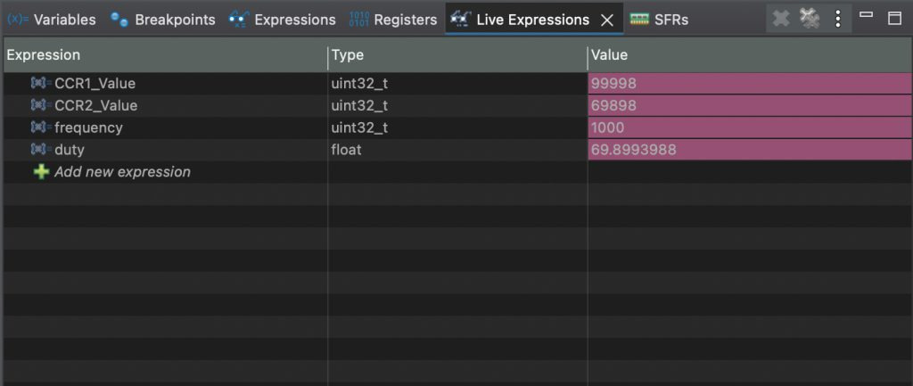 Live Expression에 CCR1_Value, CCR2_Value, duty 및 frequency를 추가합니다.