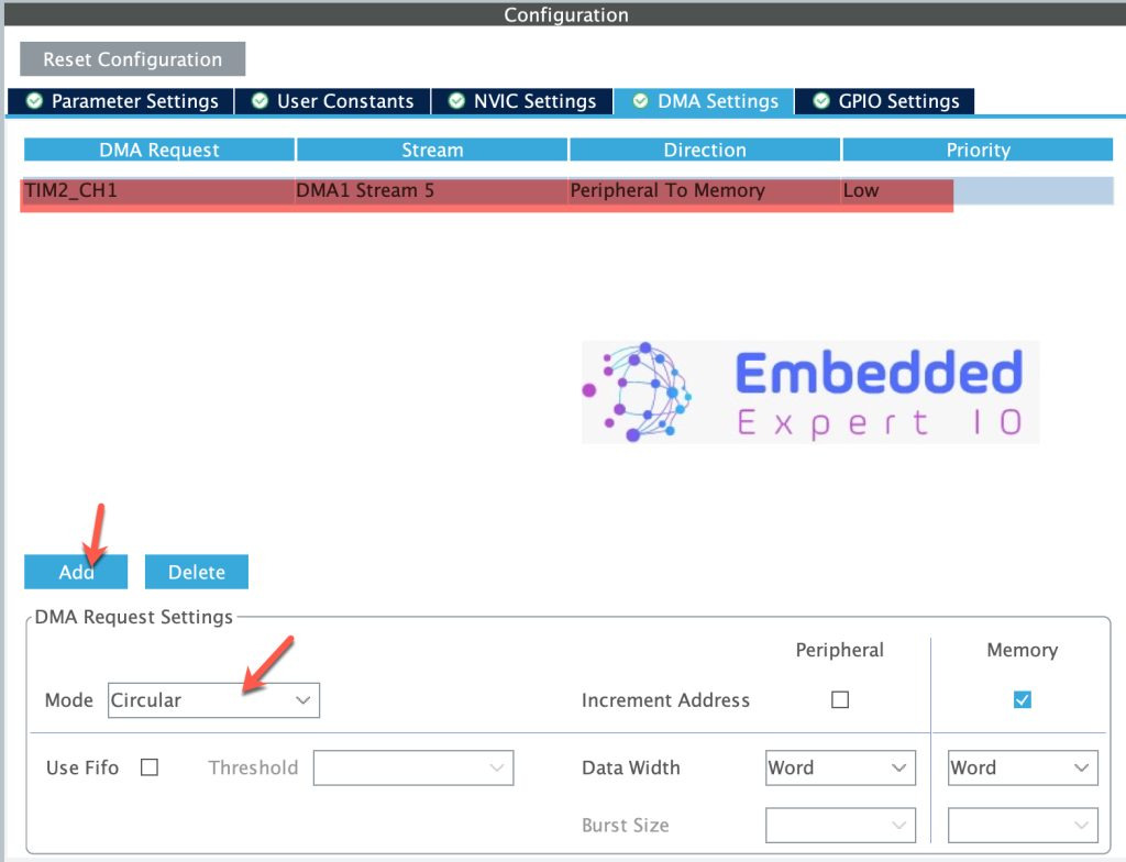 다음으로, 다음과 같이 순환 모드에서 TIM2_CH1에 대한 DMA를 활성화합니다.
