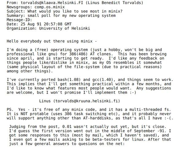 게시물을 보니 0.01은 아직 출시되지 않았지만, 거의 출시된 것 같습니다. 첫 번째 버전은 -91년 9월 중순에 출시되었을 것 같습니다. 이에 대한 몇 가지 답변을 받았습니다(대부분은 우편으로 받았는데, 저장하지 않았습니다). 심지어 리눅스 베타 테스터를 요청하는 메일도 몇 개 받았습니다. 그 후에는 인터넷에 올라온 질문에 대한 몇 가지 일반적인 답변을 남겼습니다