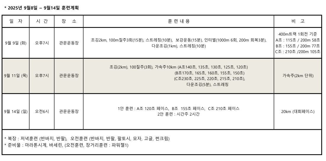 (공지) 과천관문운동장 훈련 일자 : 2025년 9월 28일 (일요일) 시간 : 오전 6시 내용 : 가벼운 조깅 40분 질주 5회