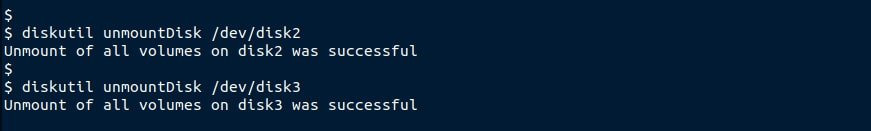 계속하기 전에 소스 및 대상 SD 카드 모두에서 파티션을 마운트 해제하세요. 디스크의 장치 이름 뒤에 diskutil unmount Disk 명령을 사용하여 이 작업을 수행할 수 있습니다. 예를 들어