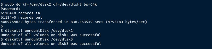 sudo dd if=/dev/disk2 of=/dev/disk3 bs=4m
