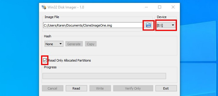 Win32DiskImager 창에서 "이미지 파일" 필드 옆에 있는 파일 아이콘을 클릭합니다.이미지 파일을 저장할 대상 폴더를 선택하고 ".img" 확장자가 있는 이름을 추가해야 합니다.제 경우에는 "CloneImageOne.img"와 같은 이름으로 문서 폴더에 이미지 파일을 넣습니다.