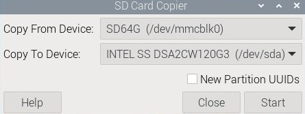 SD 카드 복사기는 Raspberry Pi 팀이 SD 카드를 다른 부팅 가능한 USB 드라이브나 SD 카드로 복제하기 위해 개발한 도구입니다. Raspberry Pi OS 데스크톱에서는 기본 메뉴 > 보조프로그램 > SD 카드 복사기 에서 찾을 수 있습니다 .
