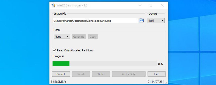 또한 "읽기 전용 할당된 파티션" 옆에 있는 확인란을 선택하는 것을 잊지 마세요. 그러면 Win32DiskImager가 실제로 사용 중이고 데이터가 저장된 디스크 부분만 복사합니다. 그렇지 않으면 SD 카드와 같은 크기의 이미지가 생성됩니다.