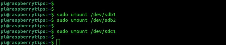sudo umount /dev/sdb1 /dev/sdb2 /dev/sdc1