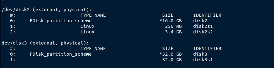 명령을 사용하여 장치 이름을 식별할 수 있습니다. 여기서는 /dev/disk2 (16GB)를 원본 드라이브로, /dev/disk3 (32GB)을 새 SD 카드로 설정했습니다.