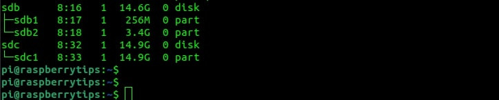 lsblk 명령은 SD 카드를 포함하여 PC에 연결된 모든 장치를 나열합니다. 아래로 스크롤하면 연결된 외장 드라이브 수에 따라 /dev/sdb 또는 /dev/sdc 등의 레이블이 붙은 장치를 볼 수 있습니다. 제 경우 /dev/sdb 는 복제할 SD 카드이고 /dev/sdc는 예비 SD 카드입니다.