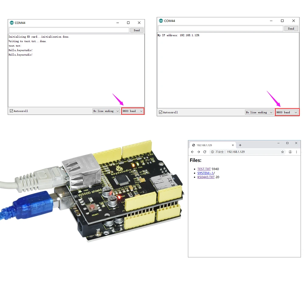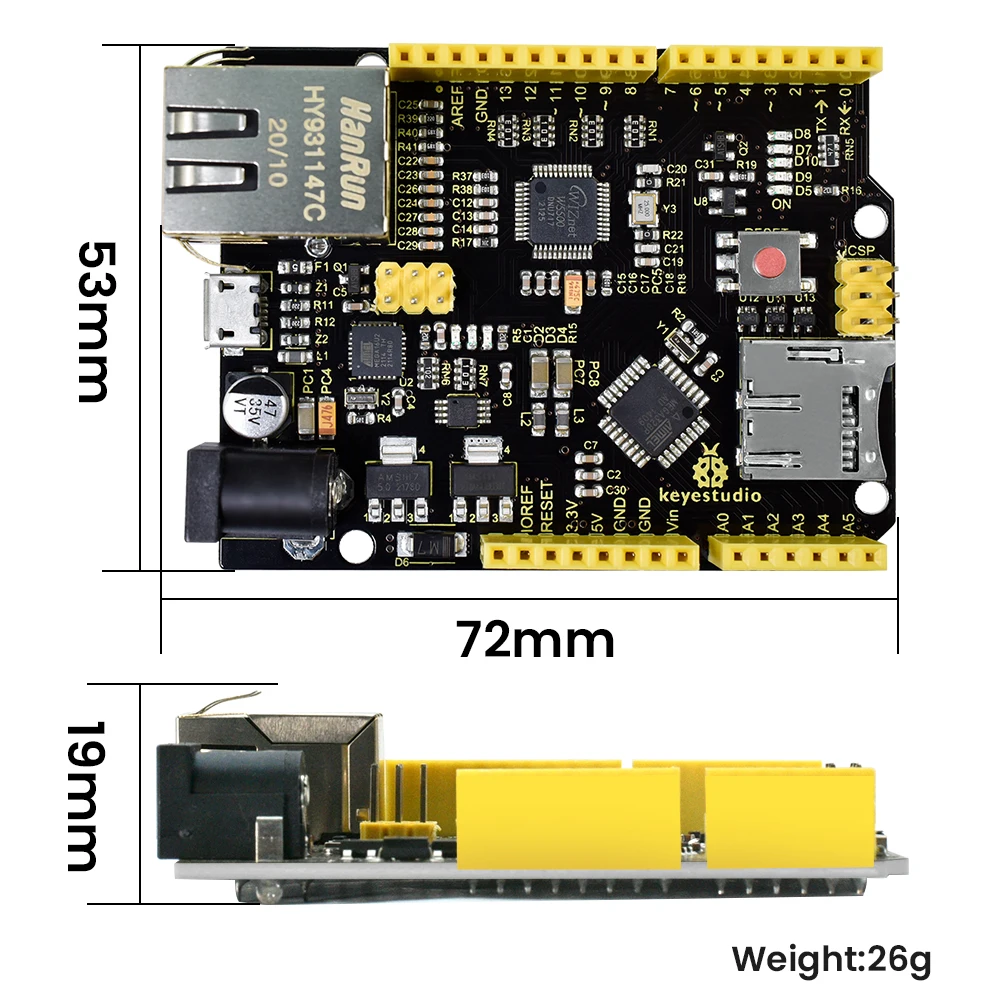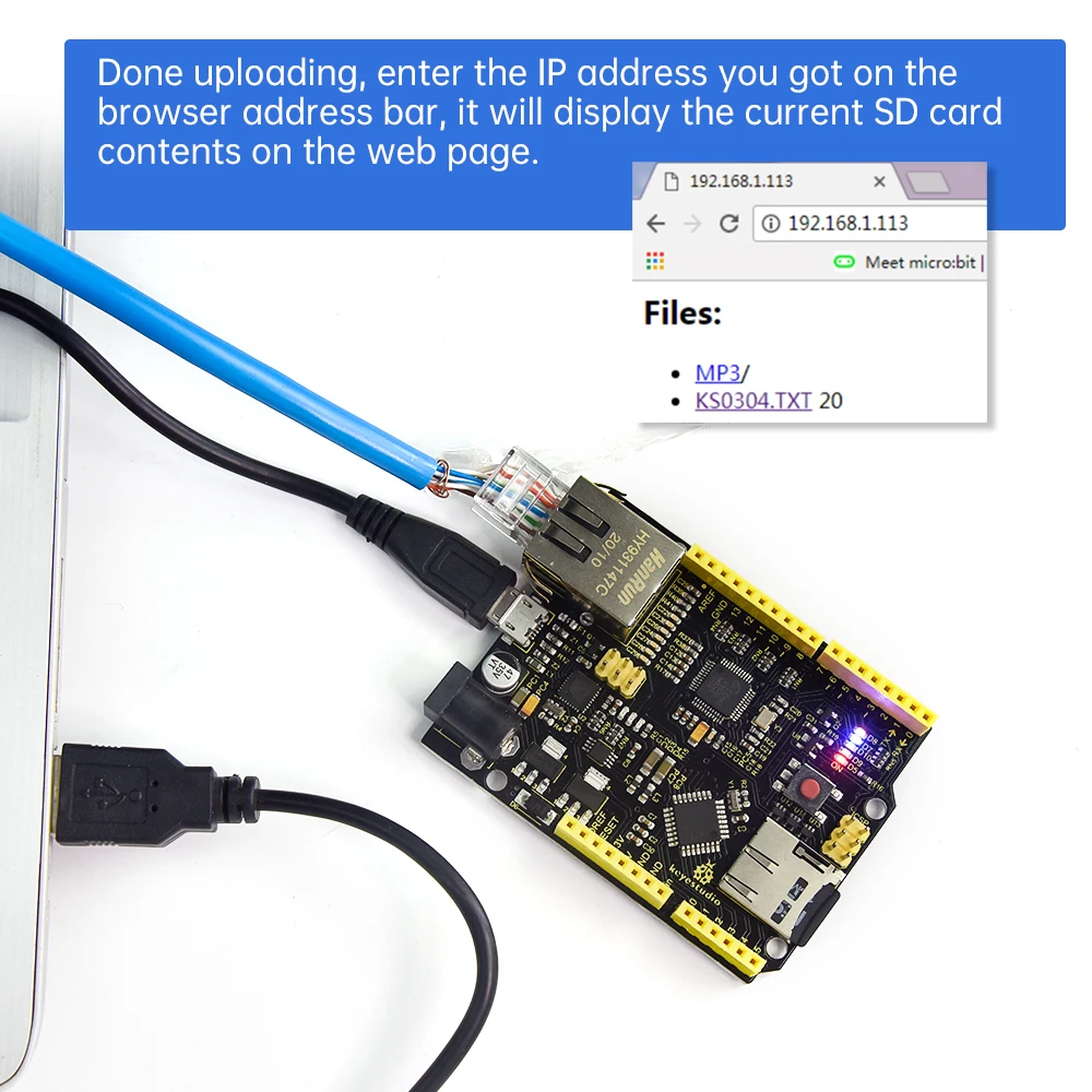 간단한 웹 서버로 만들거나 네트워크 제어를 통해 디지털 핀의 높음/낮음 수준 또는 아날로그 핀의 아날로그 값을 쓰고 읽을 수 있습니다. 그것은 keyestudio UNO R3 및 메가 2560 R3 개발 보드와 호환됩니다.