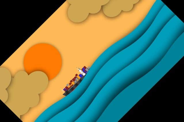 일출, 물, 화물선, 구름이 있는 애니메이션 이미지입니다. 이 글에서는 이 이미지를 이미지 회전 및 변환의 입력으로 사용합니다.