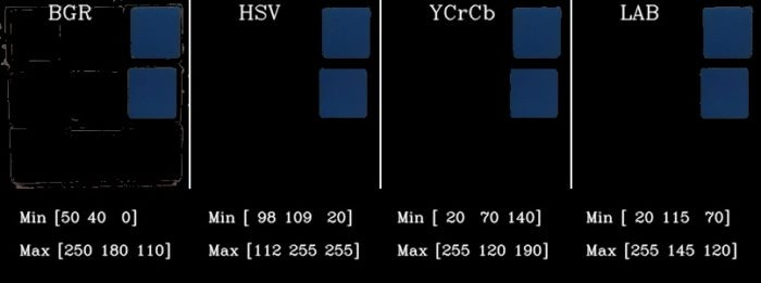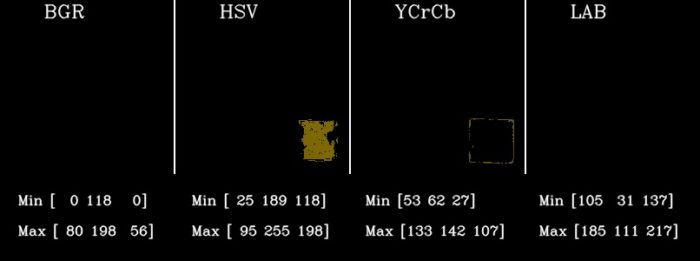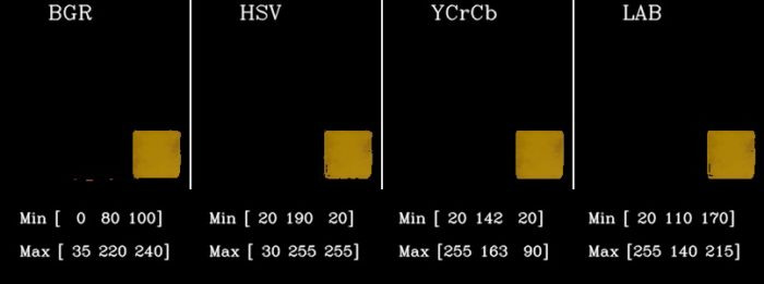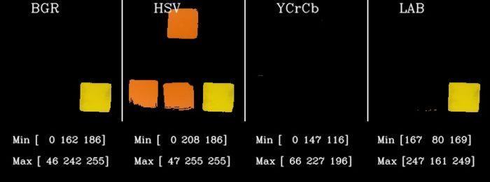 이 마지막 섹션에서는 두 번째 섹션에서 했던 것과 같은 방식으로 밀도 플롯에서 임계값을 가져와 각 색 공간에 적용하여 파란색과 노란색 부분을 감지한 결과를 보여드리겠습니다. HSV, YCrCb, LAB 색 공간에서 작업할 때는 강도(Intensity) 성분에 대해 신경 쓸 필요가 없습니다. 색상 성분에 대한 임계값만 지정하면 됩니다. 결과를 생성하기 위해 사용한 값은 그림에 표시되어 있습니다.
