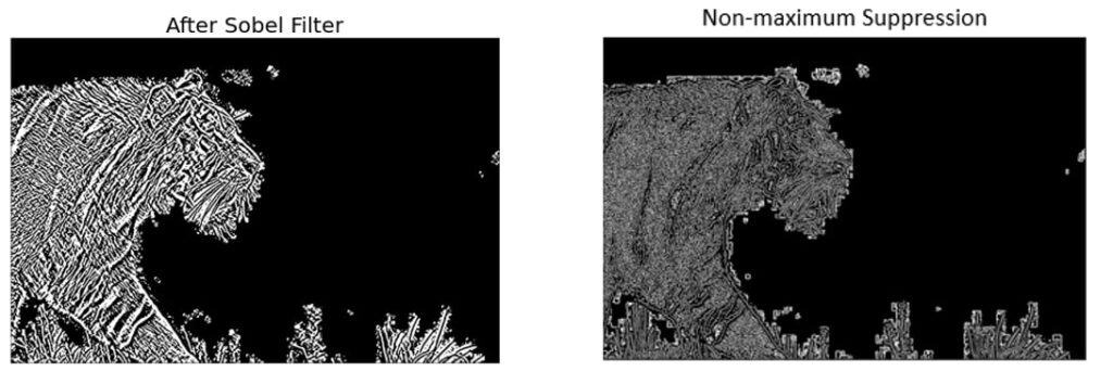 이 단계에서 알고리즘은 노이즈를 줄이고 강도 기울기를 계산한 후, 비최대값 에지 억제(non-maximum suppression of edges)라는 기법을 사용하여 원치 않는 픽셀(실제로는 에지가 아닐 수 있음)을 필터링합니다. 이를 위해 각 픽셀을 양수 및 음수 기울기 방향으로 인접 픽셀과 비교합니다. 현재 픽셀의 기울기 크기가 인접 픽셀보다 크면 변경되지 않습니다. 그렇지 않으면 현재 픽셀의 크기는 0으로 설정됩니다. 다음 이미지는 예시를 보여줍니다. 보시다시피, 호랑이 털과 관련된 수많은 '에지'가 상당히 억제되었습니다.