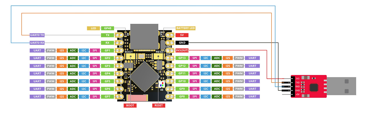 그러나 UART를 시리얼 포트로서 사용하려면 USB 시리얼 어댑터를 사용하여 TX 핀을 TX 핀에, RX 핀을 RX 핀에 연결해야 합니다.