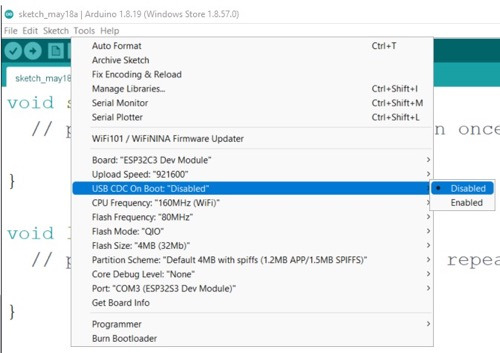 기본적으로 USB 시리얼은 활성화 상태입니다. 즉, USB Type-C를 통해 개발 보드를 PC에 연결하고 Arduino IDE에서 시리얼 모니터를 열어 시리얼로 전송되는 데이터를 확인할 수 있습니다.