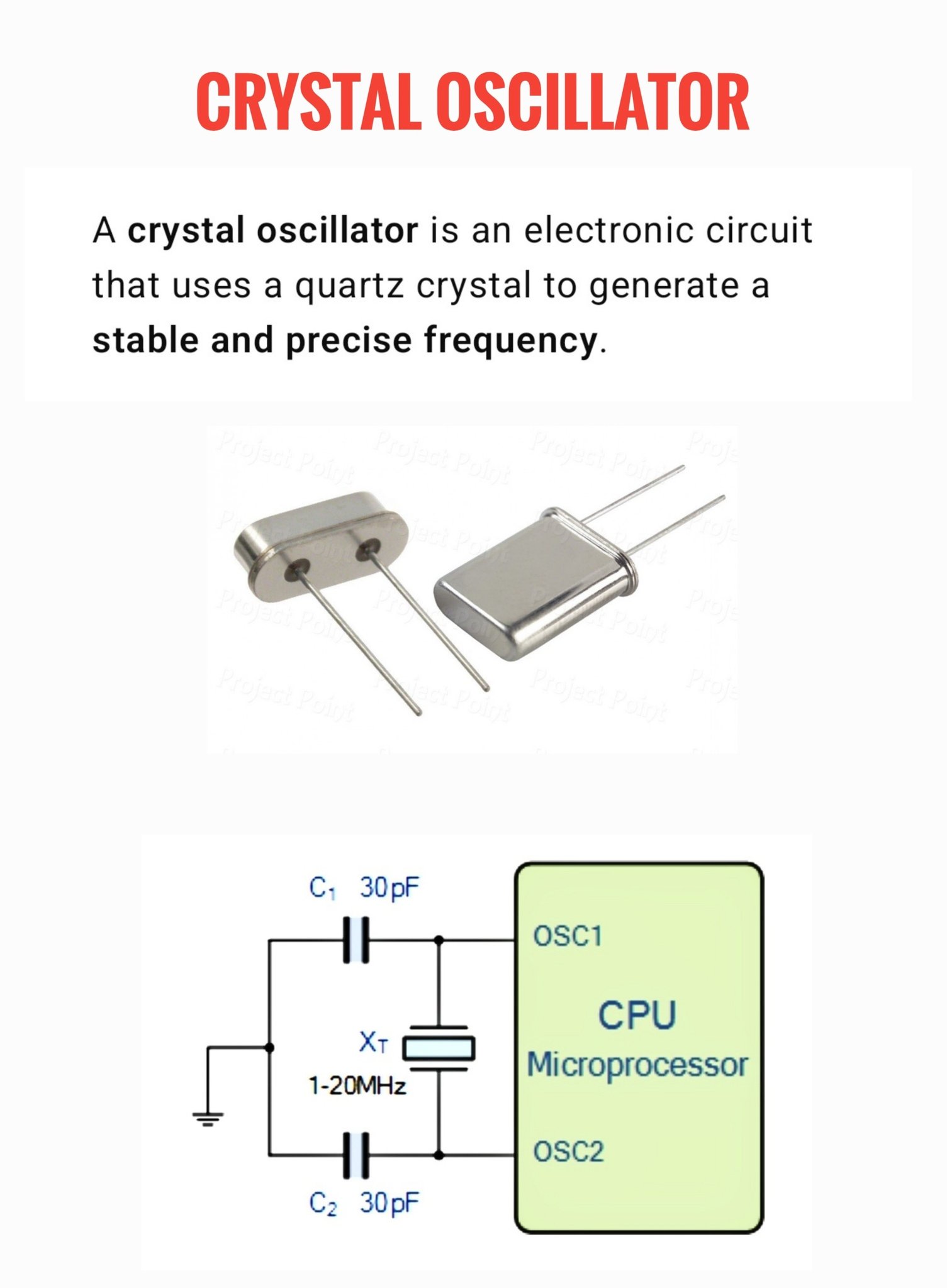 수정 발진기는 석영 크리스털을 사용하여 매우 안정적이고 정밀한 주파수를 생성하는 전자 회로입니다. 석영 크리스털은 전기장이 가해지면 특정 주파수로 진동하며, 이 특성은 회로에서 정확한 타이밍을 유지하는 데 활용됩니다.