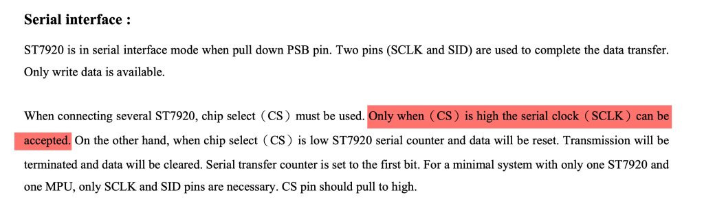 ST7920의 경우 CS 핀은 다른 SPI 주변장치의 칩 선택 핀과 다릅니다. 데이터시트에서 다음을 확인할 수 있습니다.