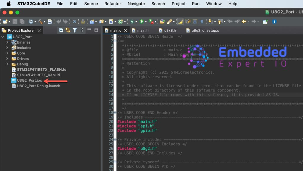 이전 프로젝트에서 다음과 같이 u8g2.ioc 파일을 엽니다.