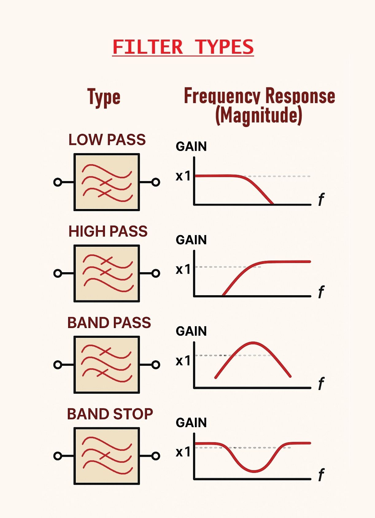 이 다이어그램은 신호의 주파수 성분을 통과시키거나 차단하는 방식에 따라 전자 필터의 네 가지 기본 유형을 설명합니다.