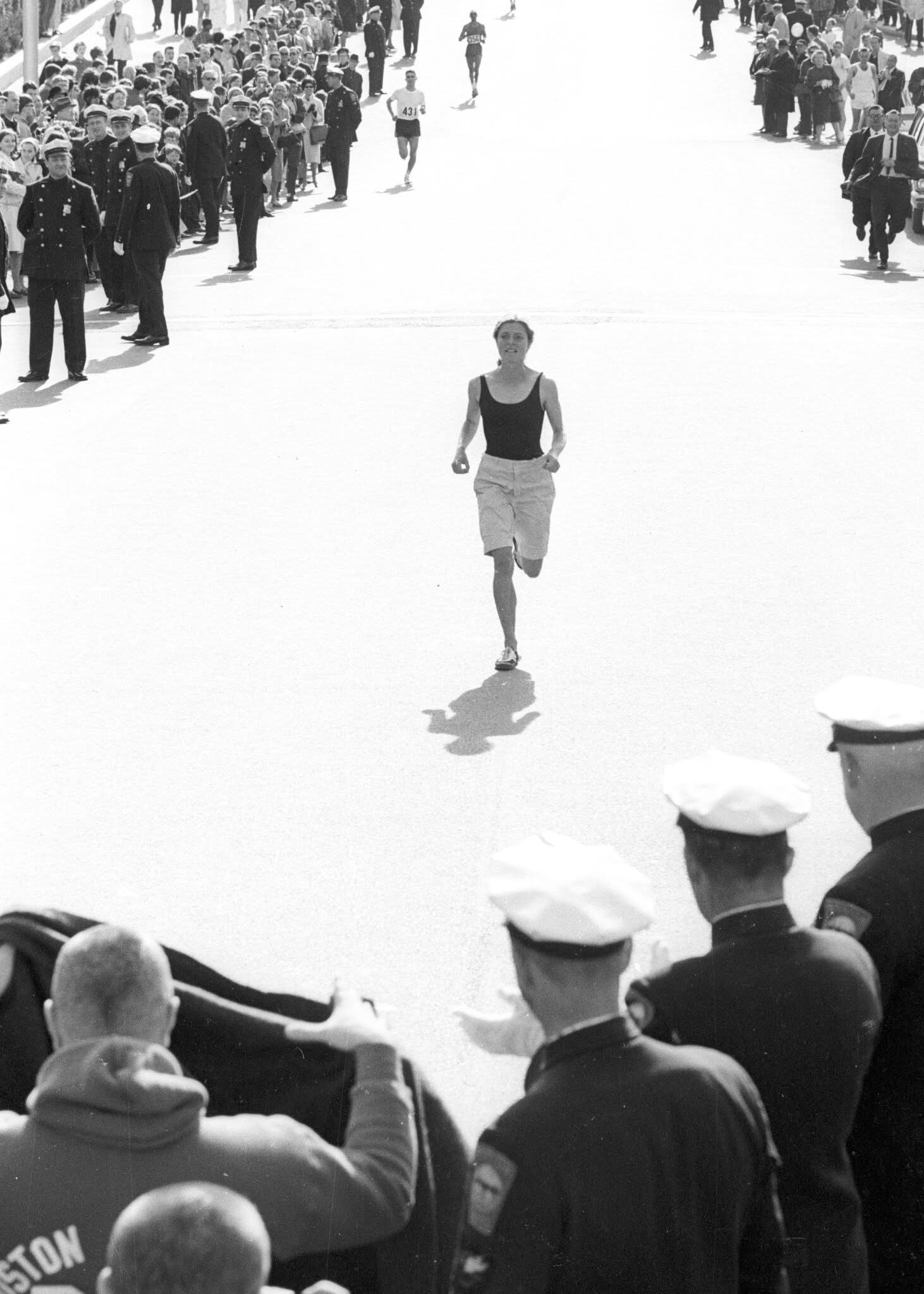 그럼에도 불구하고 달리기로 결심한 그녀는 계획을 세웠습니다. 대회 당일, 그녀는 남들과 어울리고 시선을 끌지 않기 위해 오빠의 버뮤다 반바지와 스웨트셔츠를 입었습니다. 그녀는 홉킨턴 출발선 근처 덤불에 숨었고, 경기가 시작되자 다른 선수들과 합류했습니다.
