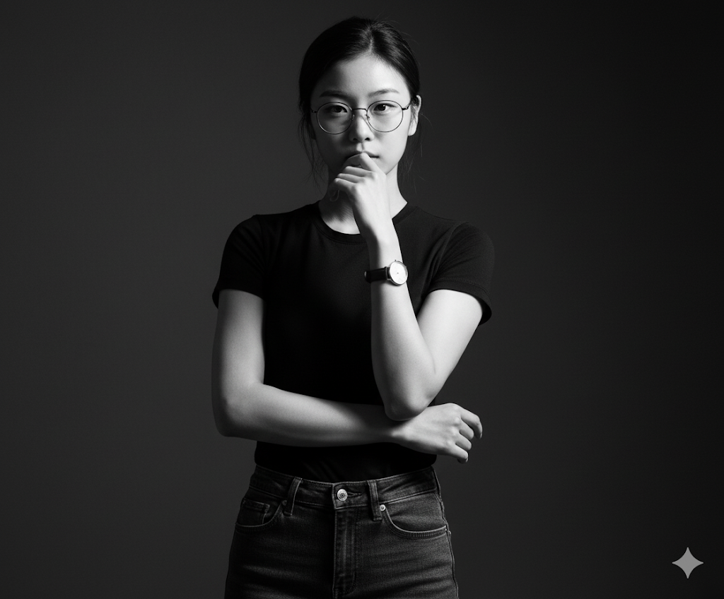"A black and white studio portrait of a young women standing against a dark background. She is wearing a plain black fitted t-shirt, dark jeans, and a wristwatch on her left hand. She has neatly styled hair and is wearing round eyeglasses. The pose is thoughtful and confident — her left arm crossed over her body while her right hand rests near her mouth, partially covering it. Her expression is calm and slightly mysterious. Dramatic lighting from one side casts strong shadows, emphasizing her facial features, glasses, and arm muscles. The overall mood is minimalistic, stylish, and cinematic, with a focus on contrast and depth. Ensure the proportions of the body and head are natural and balanced—neither the body looks bigger than the head nor the head looks disproportionately small compared to the body—matching the reference attached image."