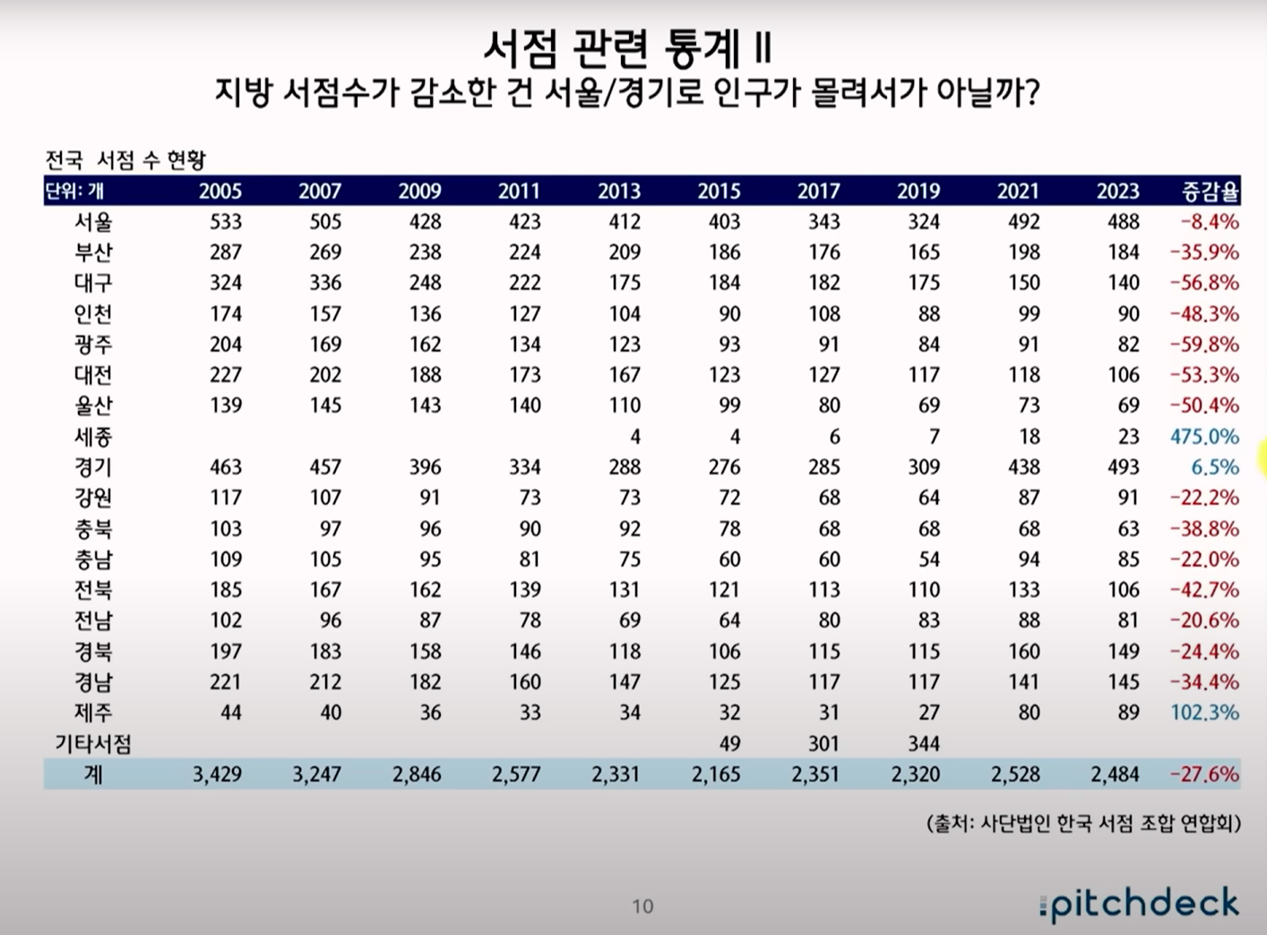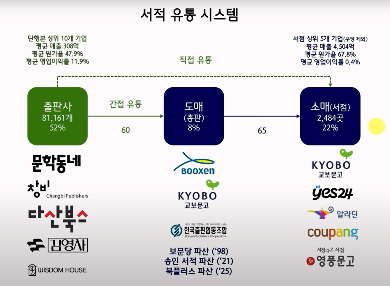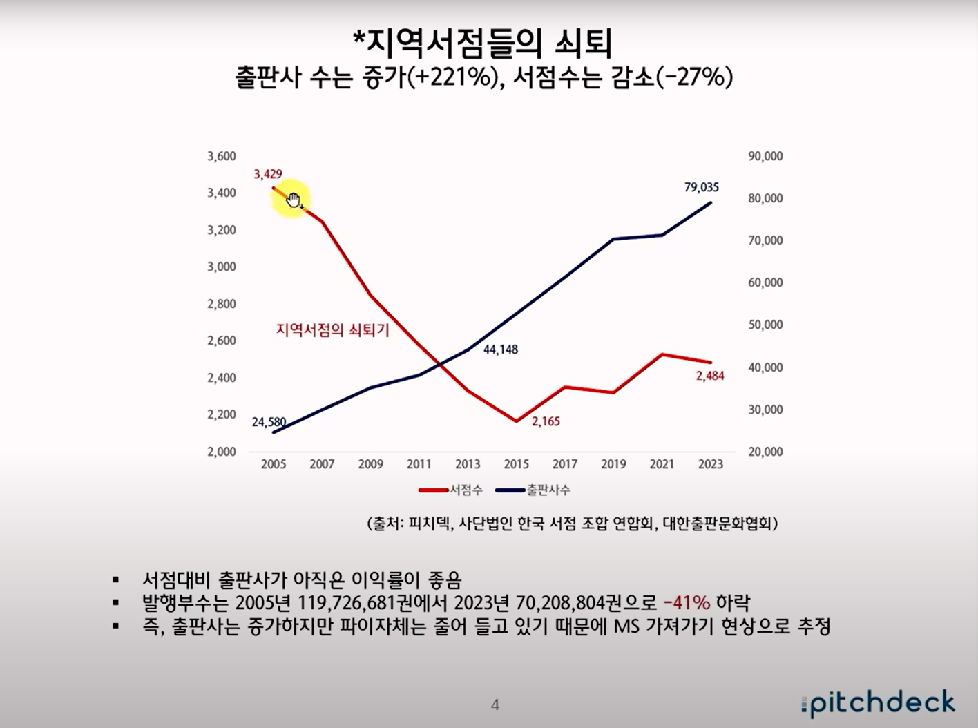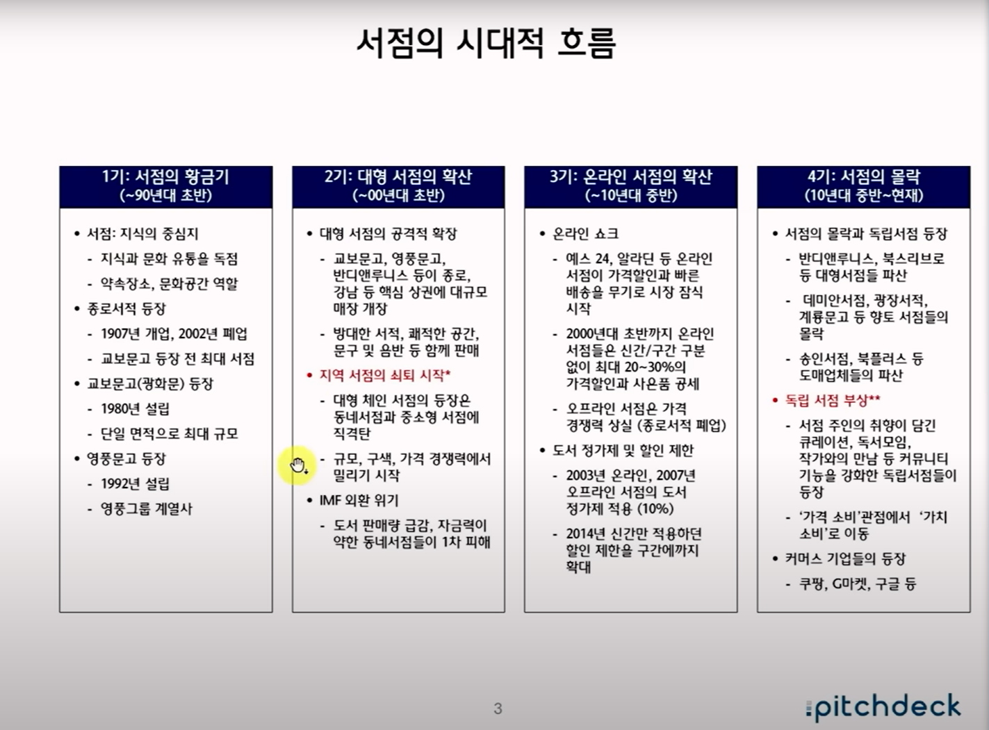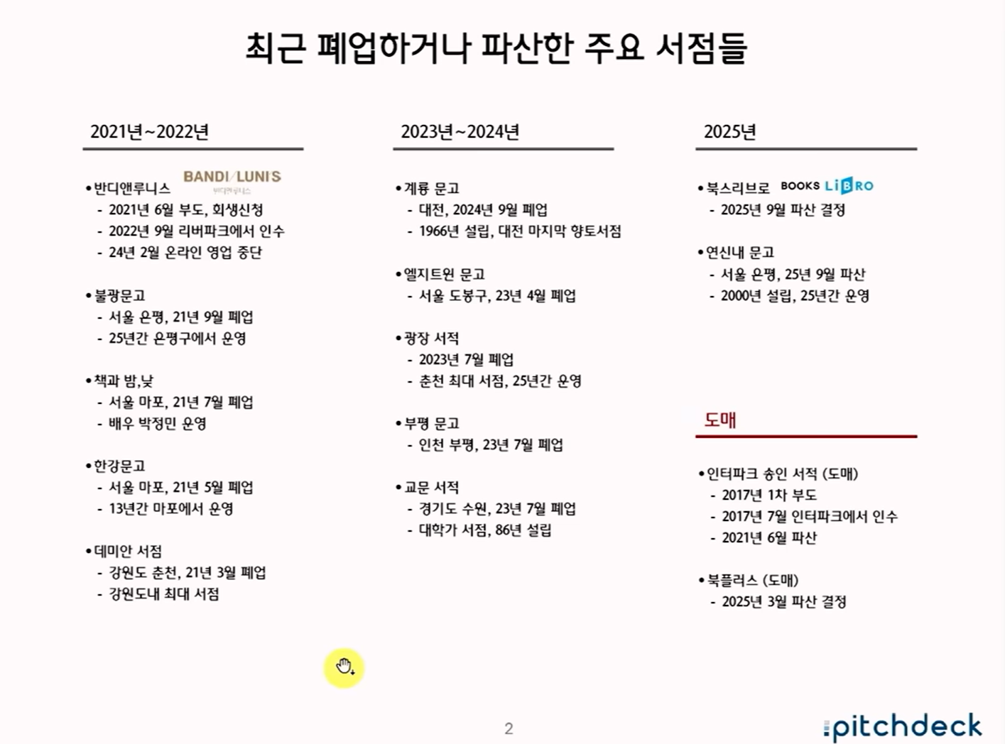 최근 서점 산업의 전반적 위기를 다룬 내용입니다. 2000년대 이후 대형서점의 전성기가 지나면서 지역 서점이 급격히 줄었고, 최근에는 온라인 서점과 쿠팡 같은 커머스 기업이 시장을 잠식하고 있습니다.
