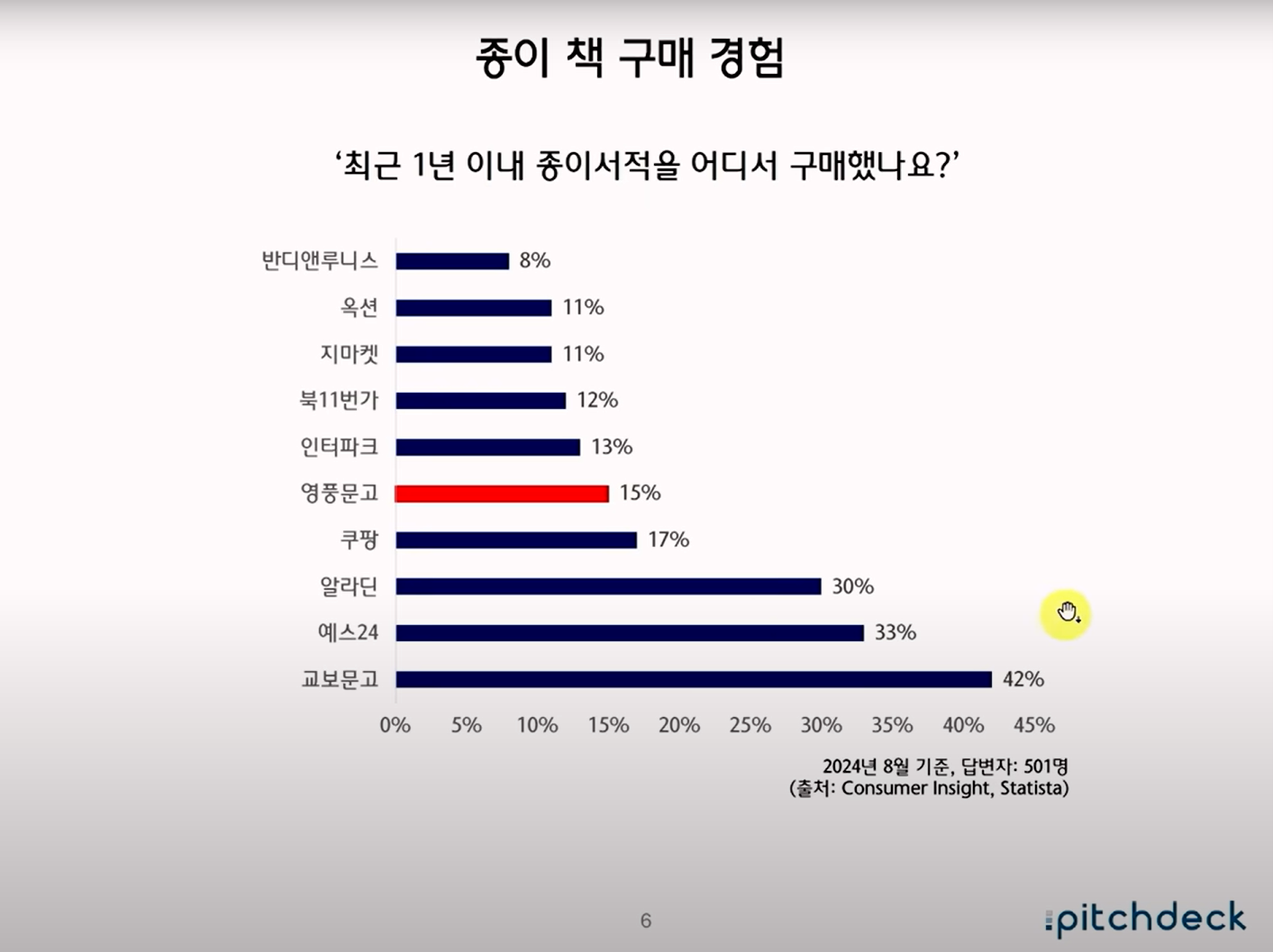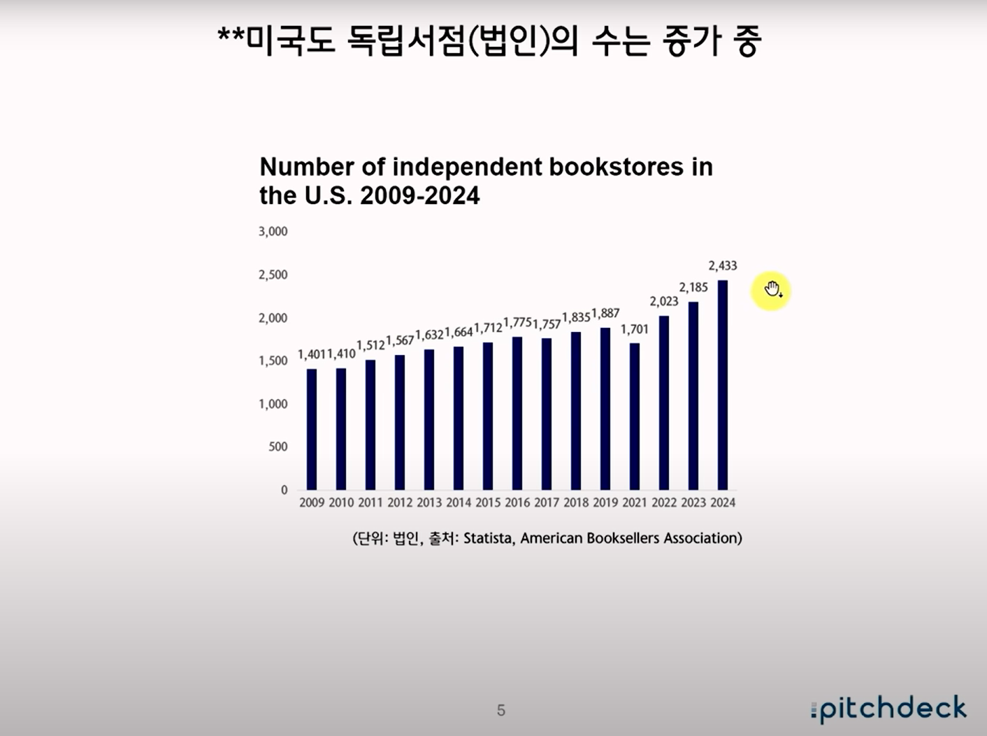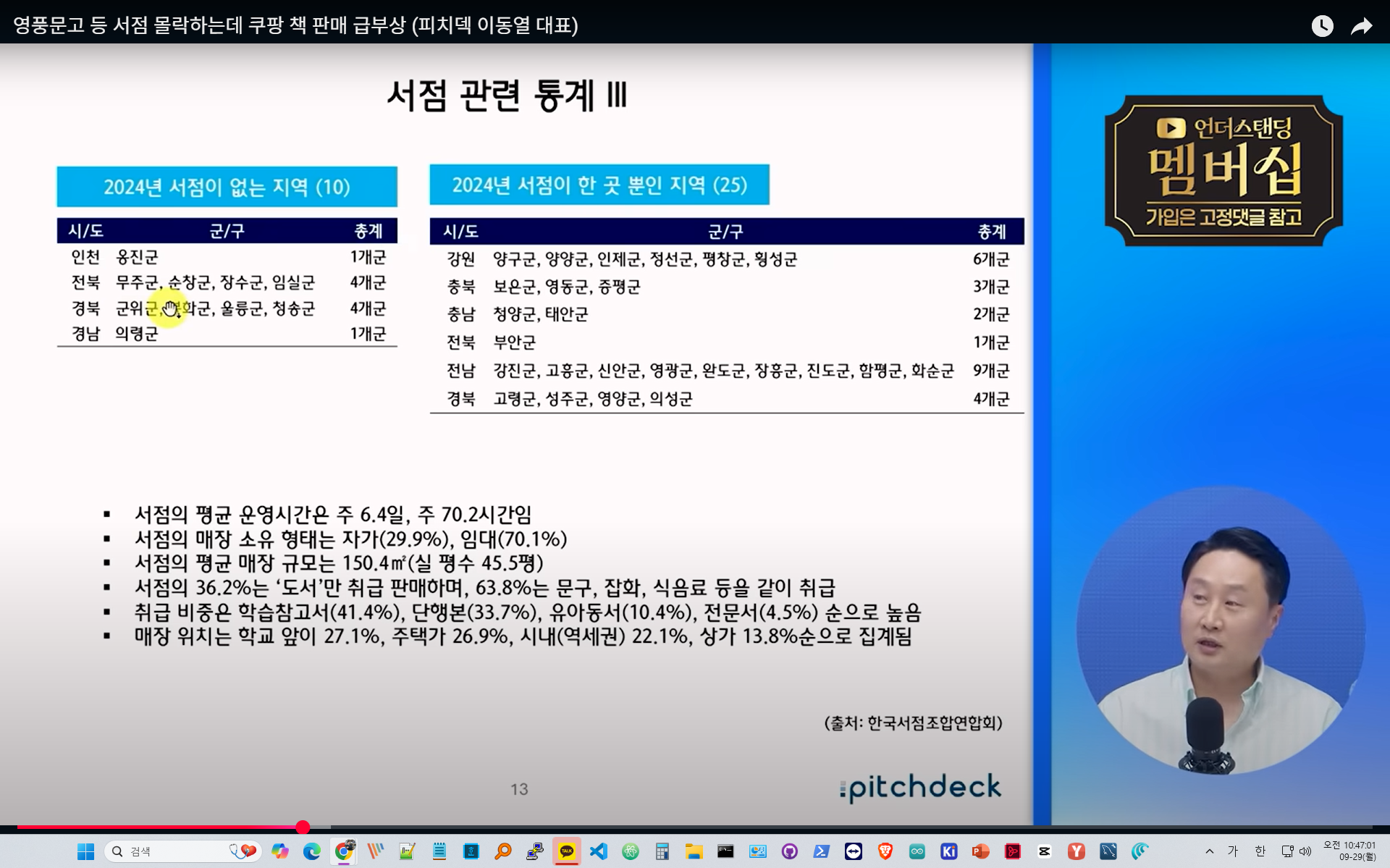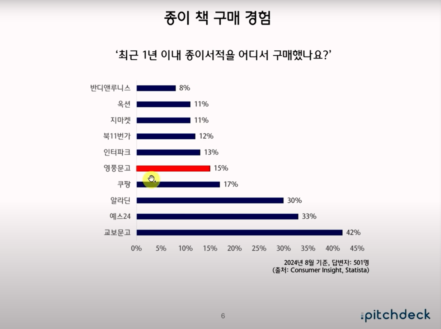 최근 서점 산업의 전반적 위기를 다룬 내용입니다. 2000년대 이후 대형서점의 전성기가 지나면서 지역 서점이 급격히 줄었고, 최근에는 온라인 서점과 쿠팡 같은 커머스 기업이 시장을 잠식하고 있습니다.