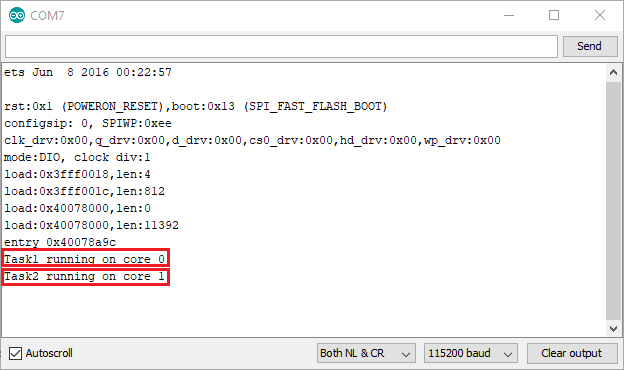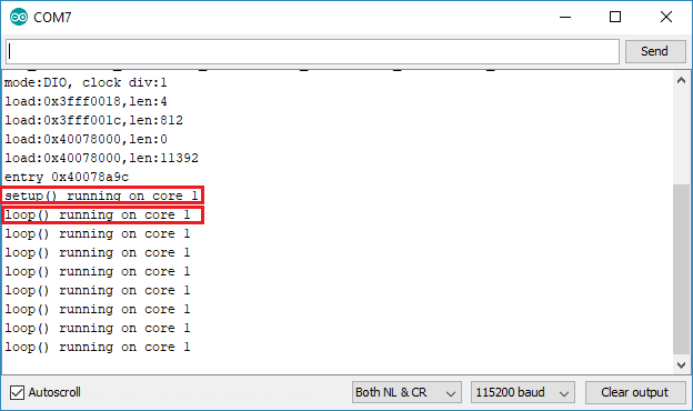 115200의 전송 속도로 직렬 모니터를 열고 Arduino 스케치가 실행 중인 코어를 확인합니다.