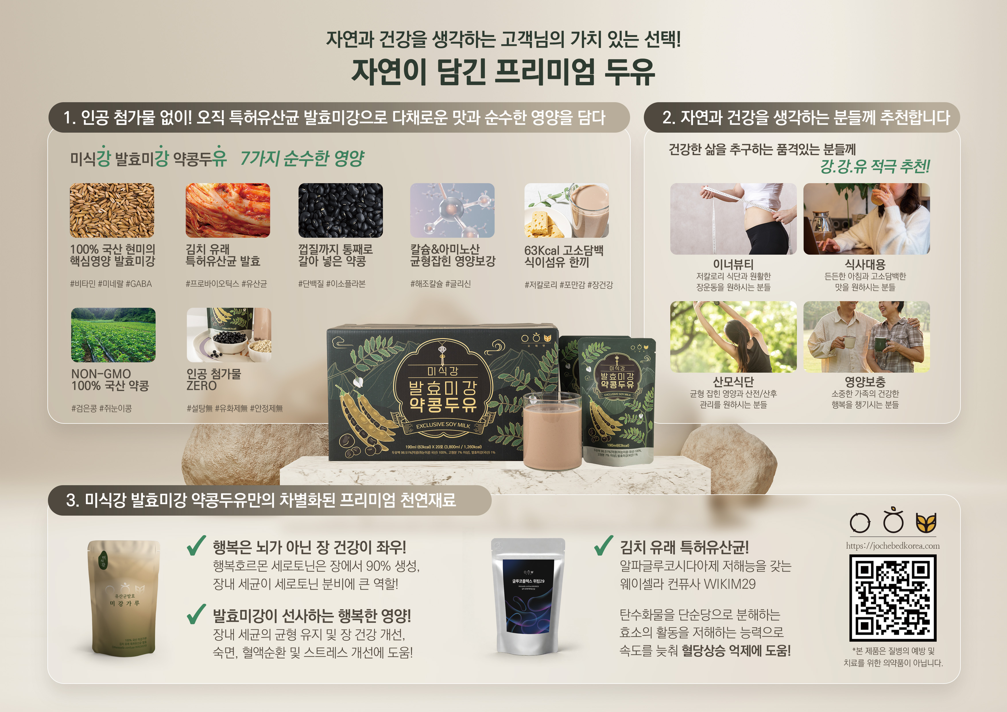 요헤벳 미식강 발효미강 약콩두유는 일반 두유와 다릅니다. 인공 첨가물을 완전히 배제하고, 핵심 천연 재료의 시너지를 극대화했습니다.