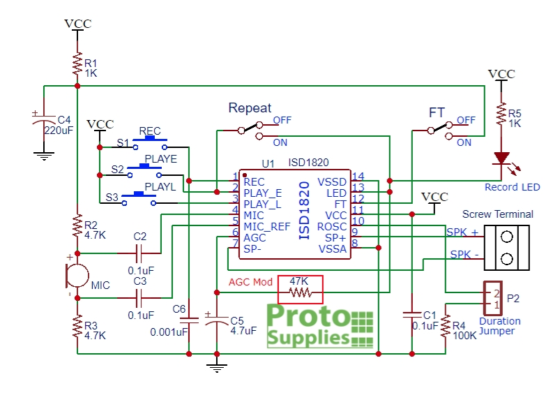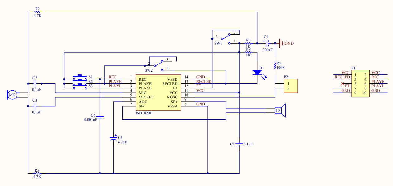 음성 녹음 모듈은 ISD1820을 기반으로 하는 다중 메시지 녹음/재생 장치입니다. 이 모듈은 진정한 단일 칩 음성 녹음 기능과 비휘발성 저장 장치, 그리고 8~20초간의 재생 기능을 제공합니다.
