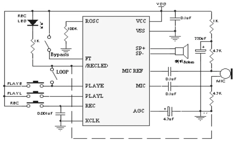 - REC: REC 입력은 활성 HIGH 녹음 신호입니다. 모듈은 REC가 HIGH일 때마다 녹음을 시작합니다. 이 핀은 녹음하는 동안 HIGH 상태를 유지해야 합니다. REC는 재생 신호(PLAYL 또는 PLAYE)보다 우선합니다.