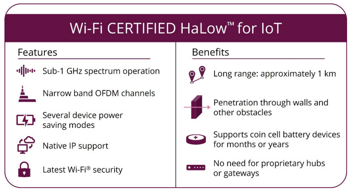 와이파이 할로우 는 저전력, 장거리 및 보다 범용인 와이파이로 1GHz 이하 주파수 대역에서 동작합니다. 에너지 효율성, 장거리 연결성, 낮은 지연 시간, 보안 기능 및 네이티브 IP 지원이 조합된 와이파이 헤일로 표준은 배터리로 동작하는 무선 연결 IoT 장치를 위해 선택 가능한 이상적인 프로토콜입니다.