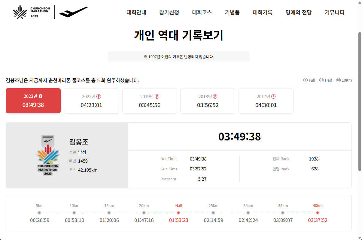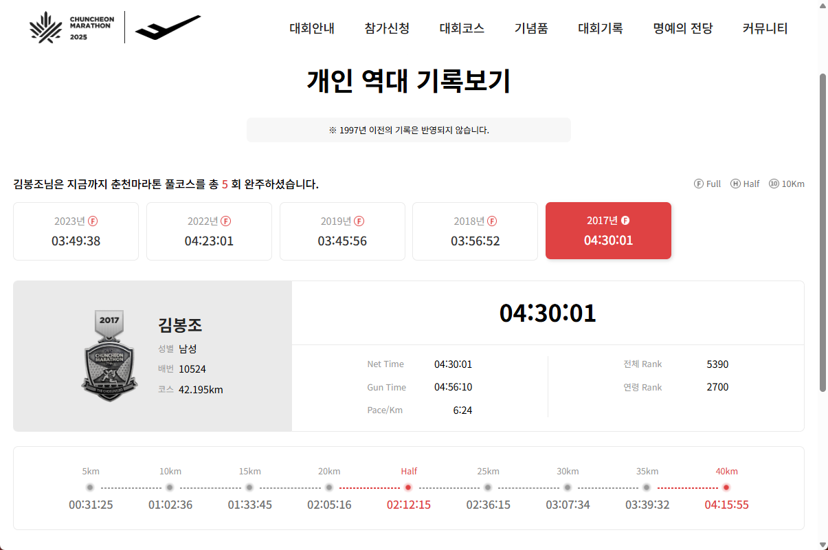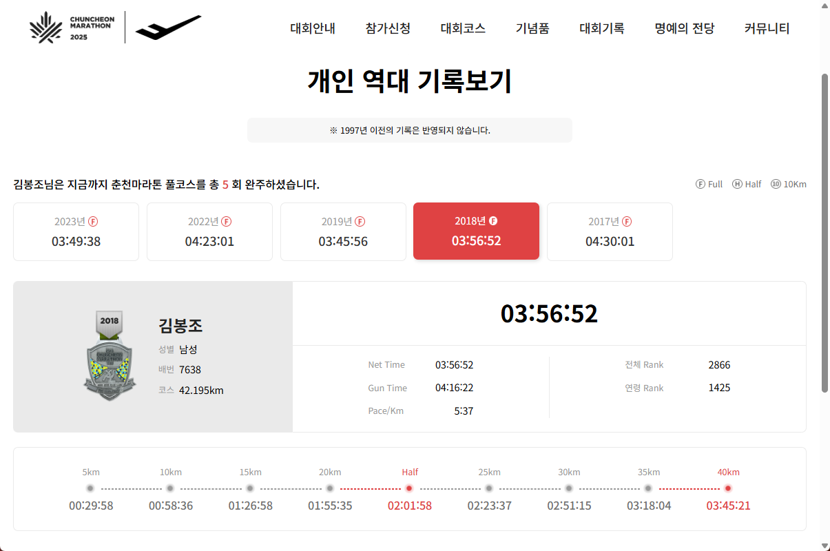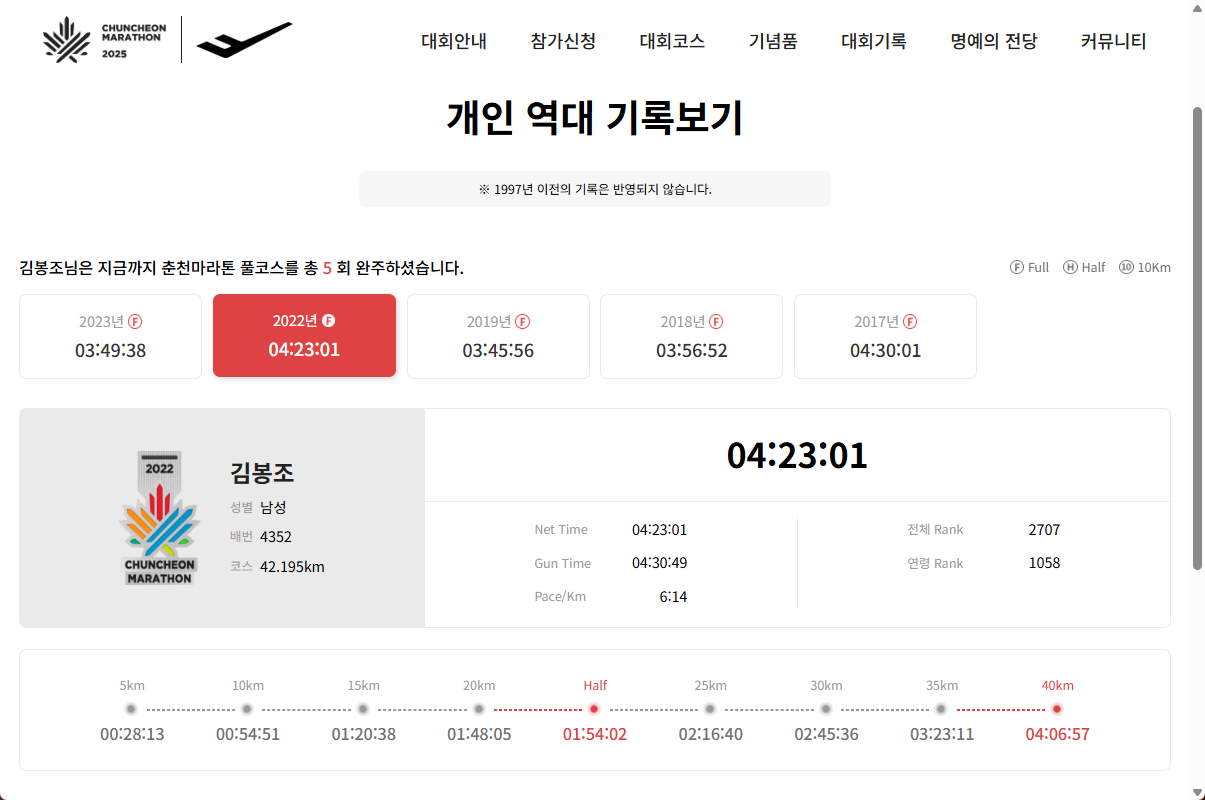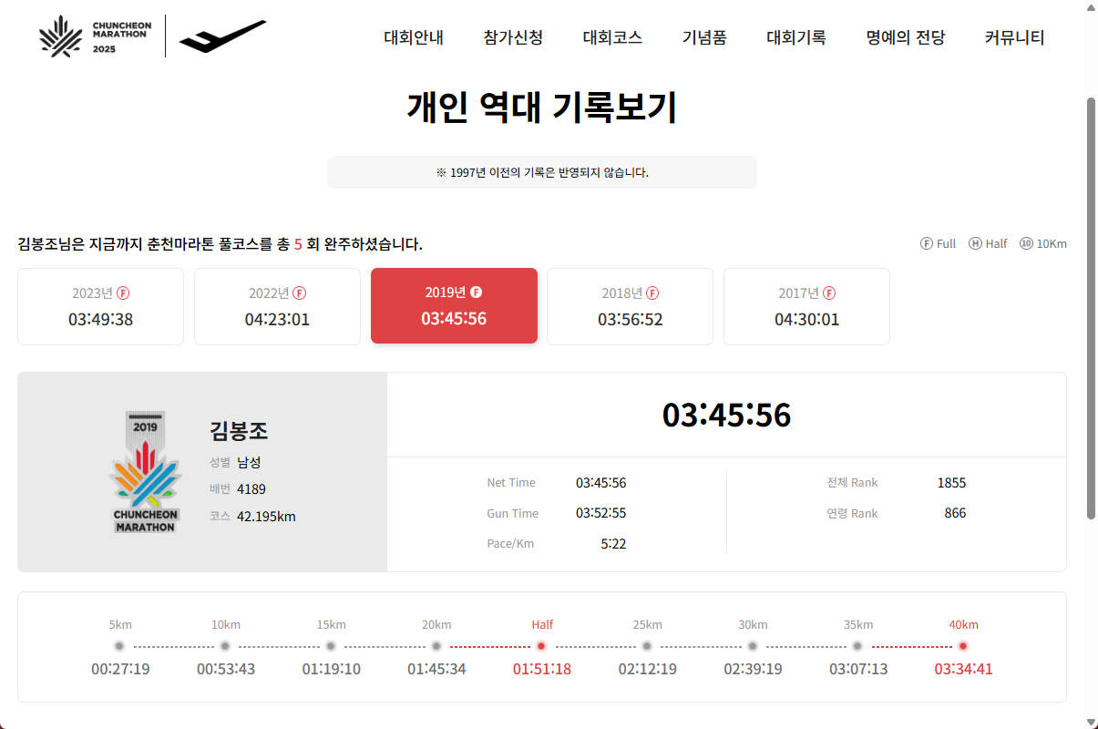 만약 멈추지 않는다면 어떤 일이 일어날까? 계속 달리게 된다. 이건 나이 문제가 아니다. 늙어가더라도 멈추지 않고 늙어가는 방법은 계속 달리는 길밖에 없다. 춘천마라톤 역대 기록을 살펴본다. 제법 잘 달리고 있다.