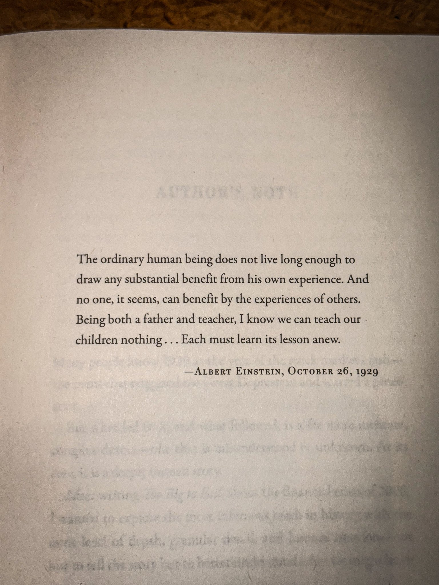 "보통의 인간은 자신의 경험으로부터 실질적인 이익을 얻기에는 너무 짧은 삶을 산다. 그리고 아무도 타인의 경험으로부터 교훈을 얻을 수는 없는 듯하다. 아버지이자 교사로서, 나는 우리가 아이들에게 아무것도 가르칠 수 없다는 것을 안다. 모든 존재는 각자 스스로의 교훈을 새롭게 배워야 한다."