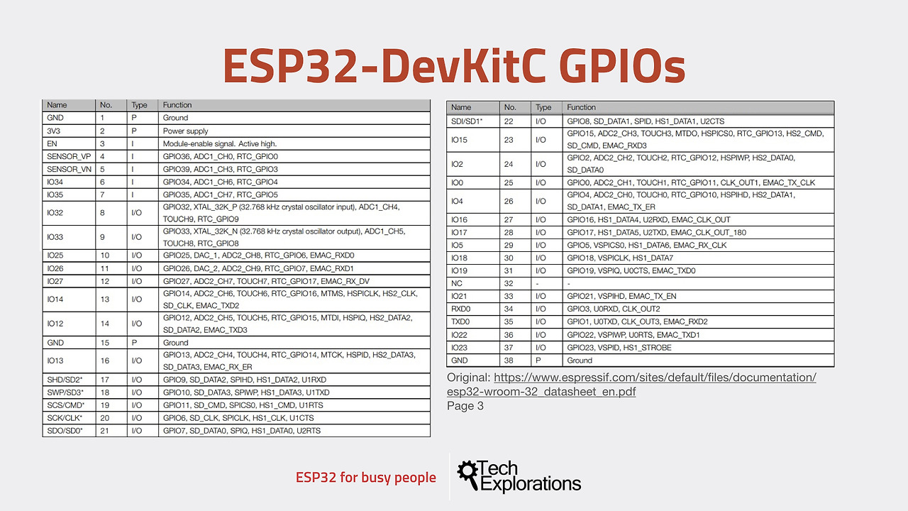 ESP32 핀과 그 역할에 대한 모든 정보는 WROOM-32 데이터시트 에서 확인할 수 있습니다 . 아래 그림은 제가 가장 자주 사용하는 핀이 포함된 데이터시트의 일부를 발췌한 것입니다.