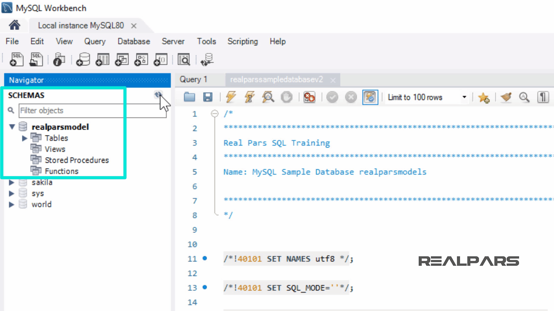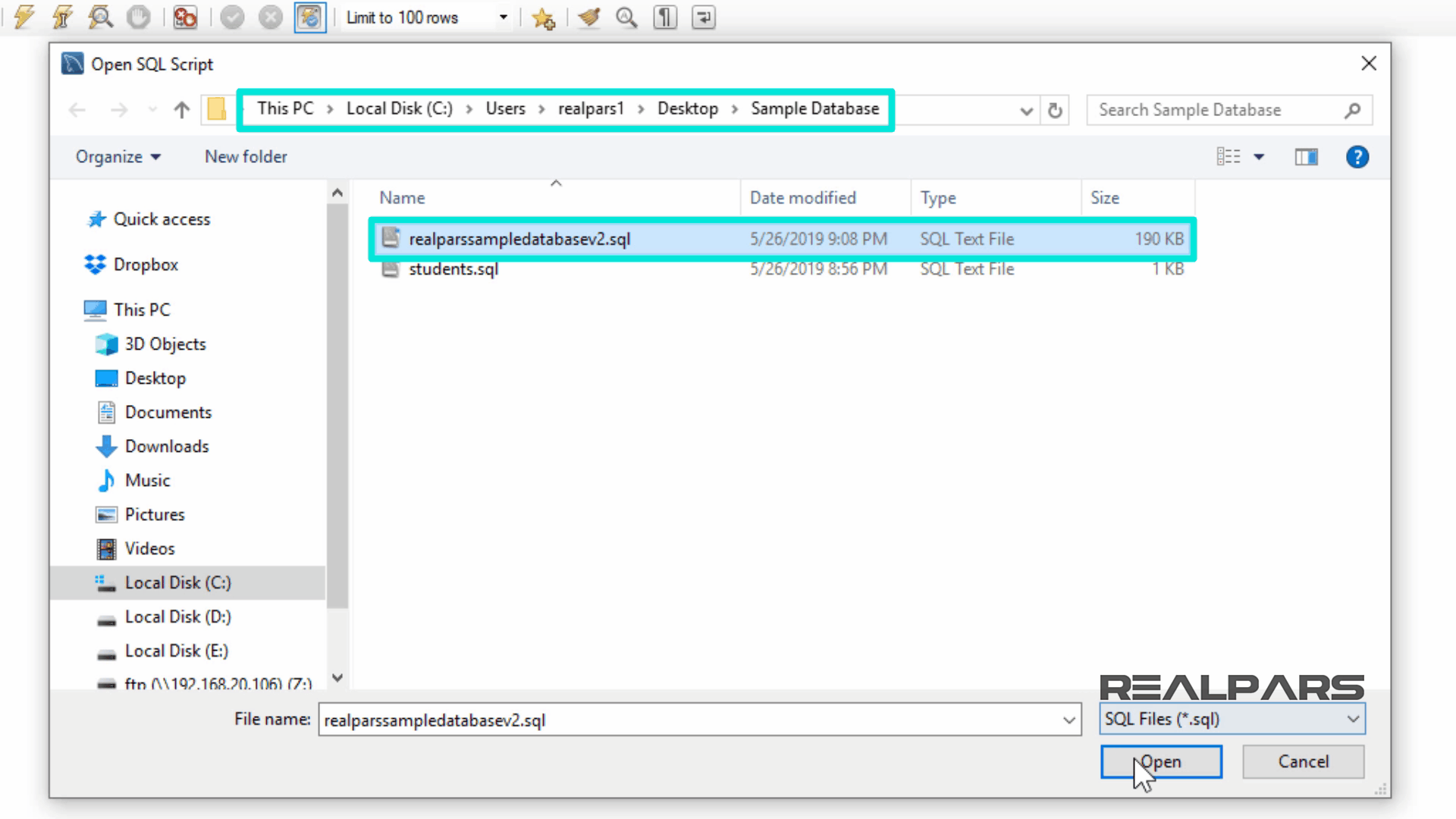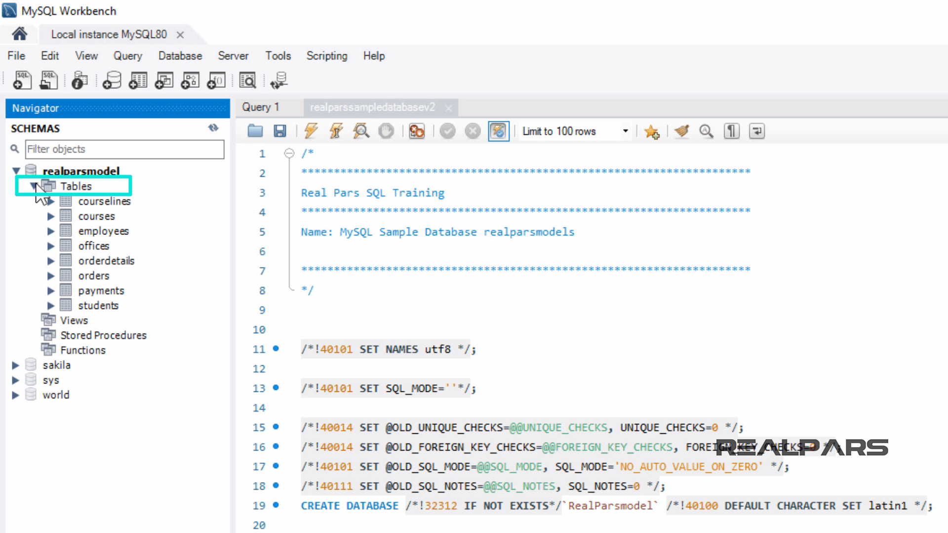 realparssampledatabasev2.sql 이라는 스크립트를 열어보겠습니다 .