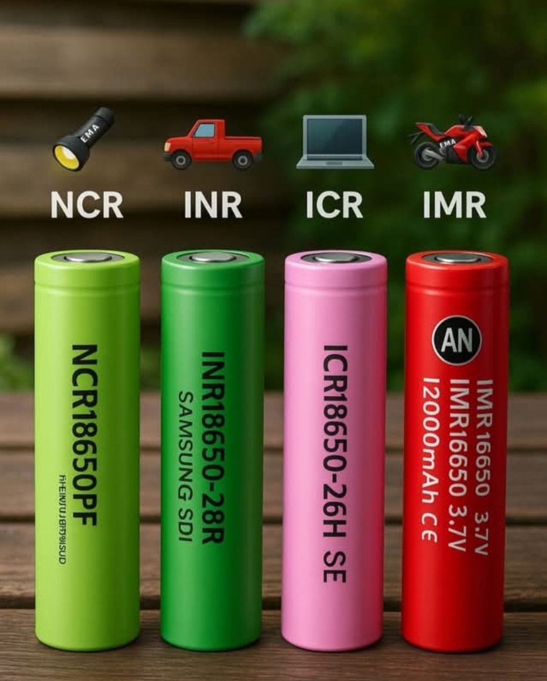 이 이미지는 네 가지 유형의 리튬 이온 원통형 배터리(18650 형식)를 보여주며, 각 배터리의 화학적 구성과 주요 용도를 나타내는 라벨과 아이콘이 함께 제공됩니다.