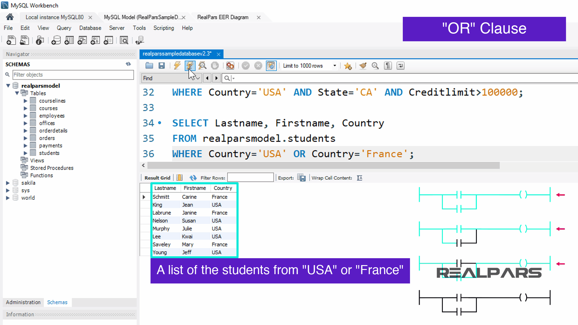 이제 학생 테이블 에서 SELECT 문을 사용하면 결과에 국가가 USA 또는 France 인 레코드가 표시되므로 쿼리는 다음과 같이 작성됩니다.