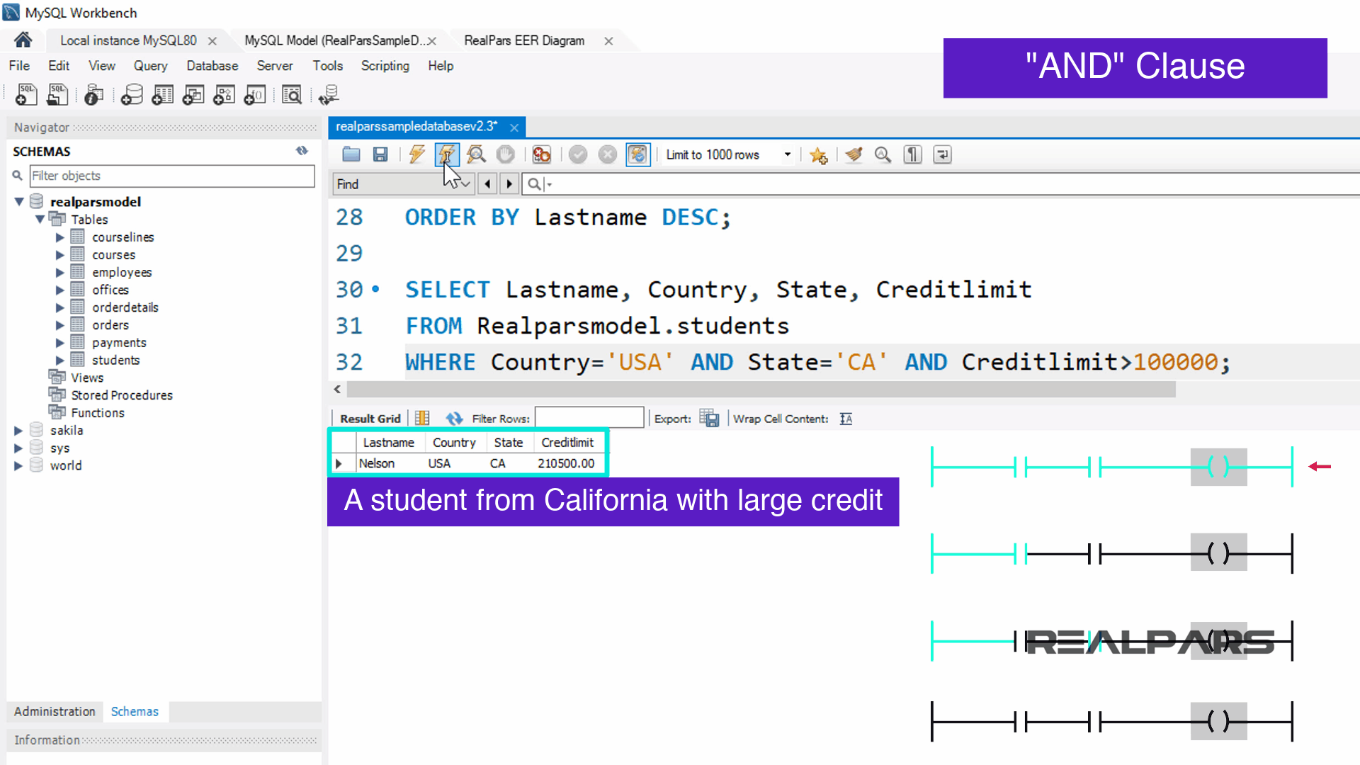 이제 학생 테이블 에서 SELECT 문을 사용하여 결과에 국가가 USA 이고 주가 California 이며 신용 한도가 100,000달러보다 큰 레코드만 표시되도록 하면 쿼리는 다음과 같이 작성됩니다.