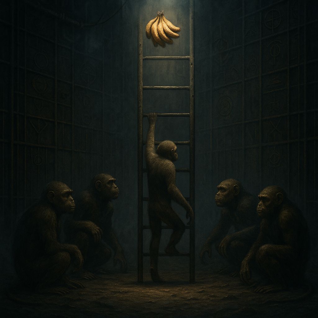 몇 번의 시도 끝에 원숭이들은 사다리를 오르면 모두가 고통을 받는다는 것을 깨달았습니다. 곧 아무도 사다리 근처에 가지 못했습니다.